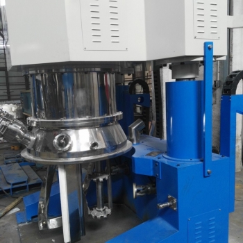 對(duì)于粘稠物料而言,雙行星混合攪拌機(jī)裝有低速攪拌部件和高速分散部件,低速攪拌部件采用行星式齒輪傳動(dòng),攪拌槳在公轉(zhuǎn)時(shí)也自轉(zhuǎn),使物料上下及四周運(yùn)動(dòng),從而在較短時(shí)間內(nèi)達(dá)到理想的混合效果。而雙行星混合攪拌機(jī)的同速分散部件與行星架一起公轉(zhuǎn),同時(shí)高速自轉(zhuǎn),使物料受到強(qiáng)烈的剪切與分散混合,它的效果是普通混合攪拌機(jī)的幾倍。該雙行星混合攪拌機(jī)的分散部件分為單分散和雙軸分散,客戶可根據(jù)需要選擇適配。